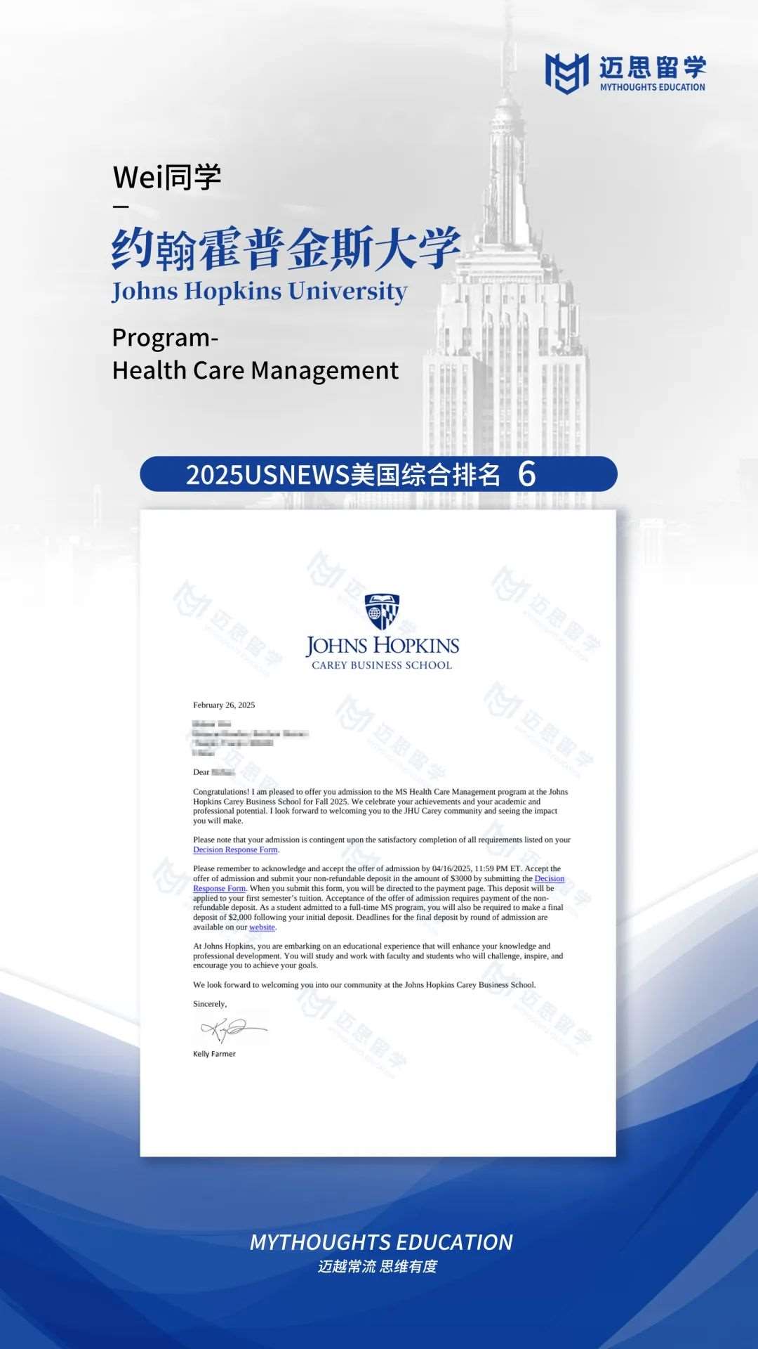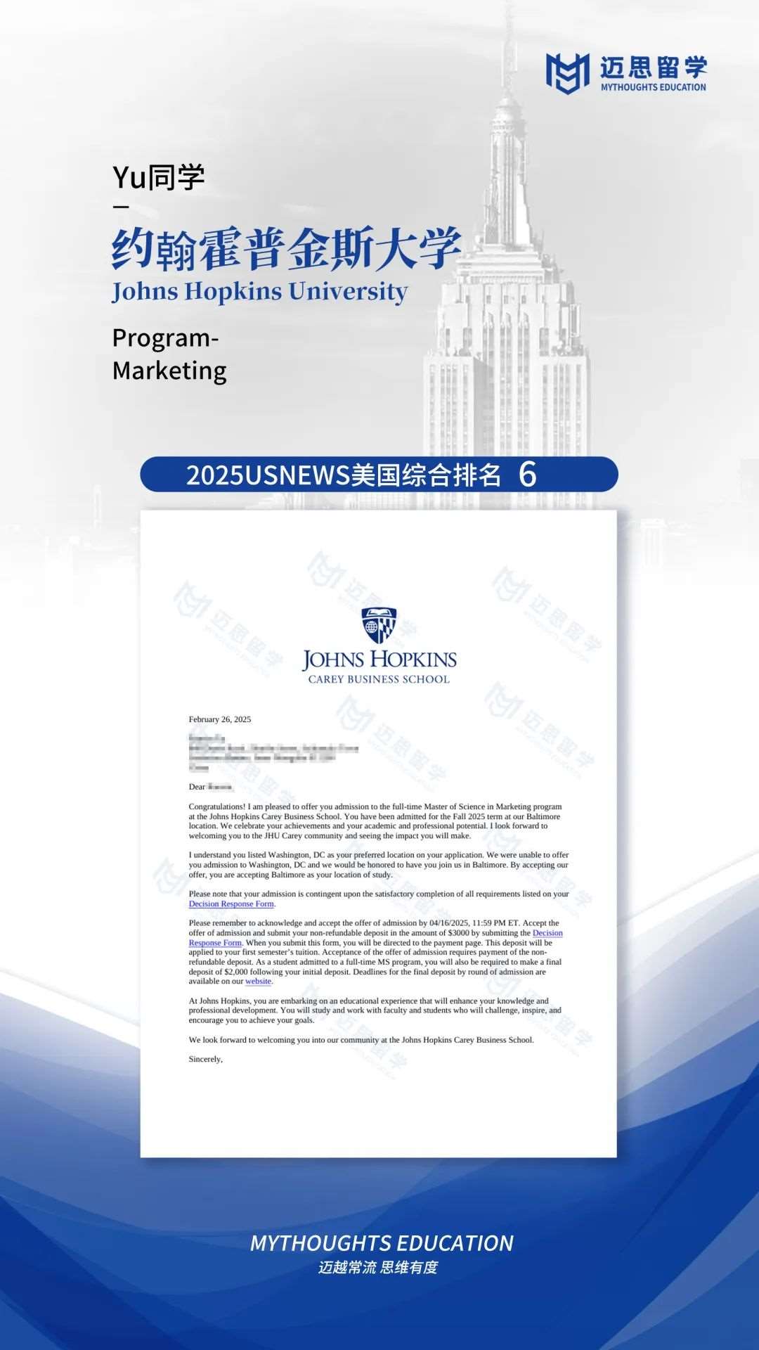 约翰霍普金斯大学的商学院offer两枚,全美第六还是很香的~